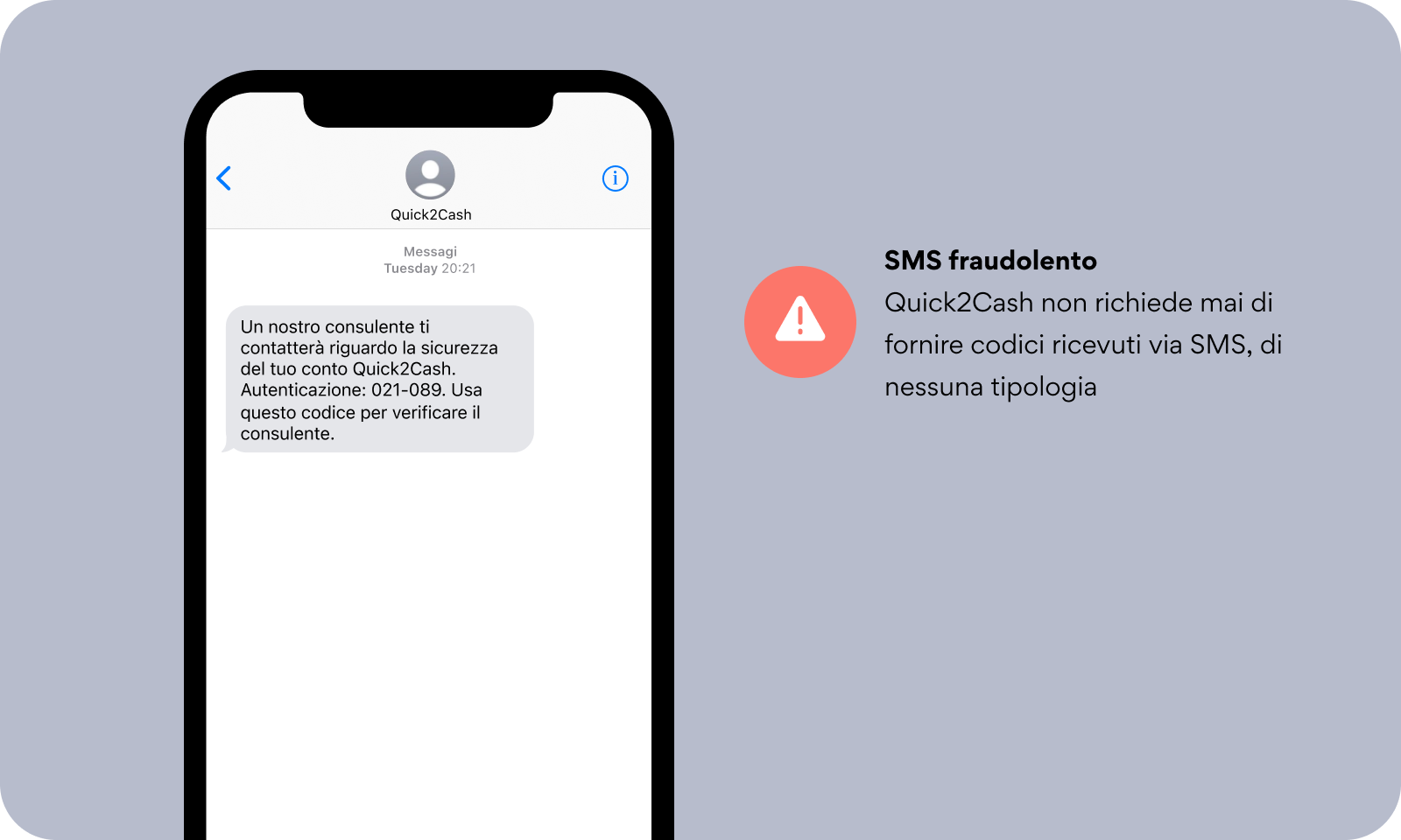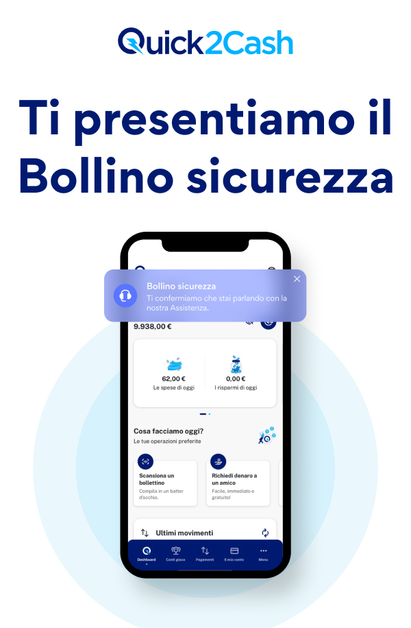 Se stai parlando con qualcuno che si presenta come un “operatore autorizzato Quick2Cash”, e magari ti chiede un codice che hai ricevuto via SMS, ma nella Home della tua app Quick2Cash non vedi il Bollino sicurezza, allora riattacca subito: è un tentativo di truffa.