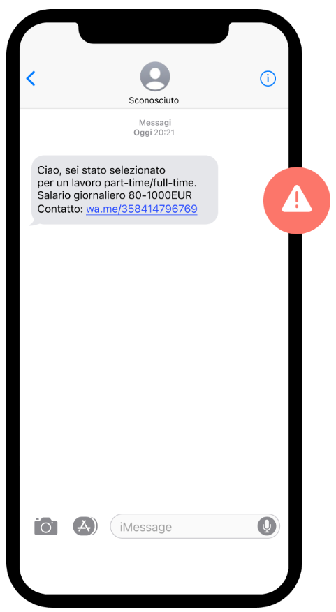 Il contenuto del messaggio si presenta generalmente vago: menziona solo un eventuale pagamento, la possibilità di lavorare da casa e per avere ulteriori dettagli viene richiesto alla vittima di rispondere.